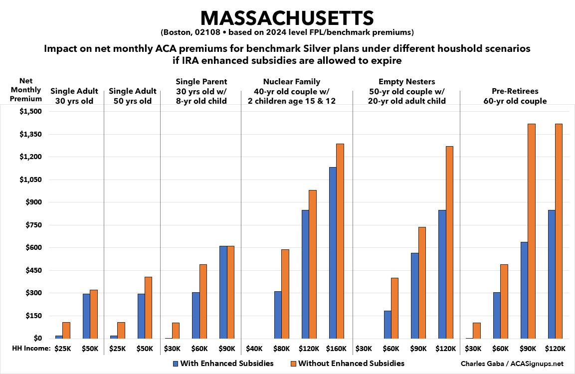That's the macro level, however. As I did a couple of years ago when the subsidies were originally at risk of expiring in 2023, I decided to run the numbers myself to get an idea of just how much enrollees real-world health insurance premiums would go up in the event the ARPA/IRA subsidies are indeed allowed to expire at the end of next year.