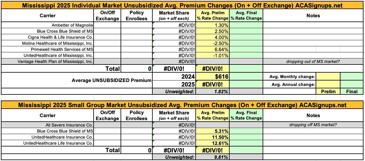 Mississippi: Preliminary avg. unsubsidized 2025 #ACA rate changes: +1.8% (unweighted)