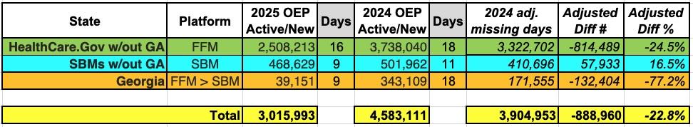 In addition, if you look only at 2025 FFM states (that is, not including Georgia in either year), active + new enrollments are still down 24.5% after adjusting for the 2 missing days.
