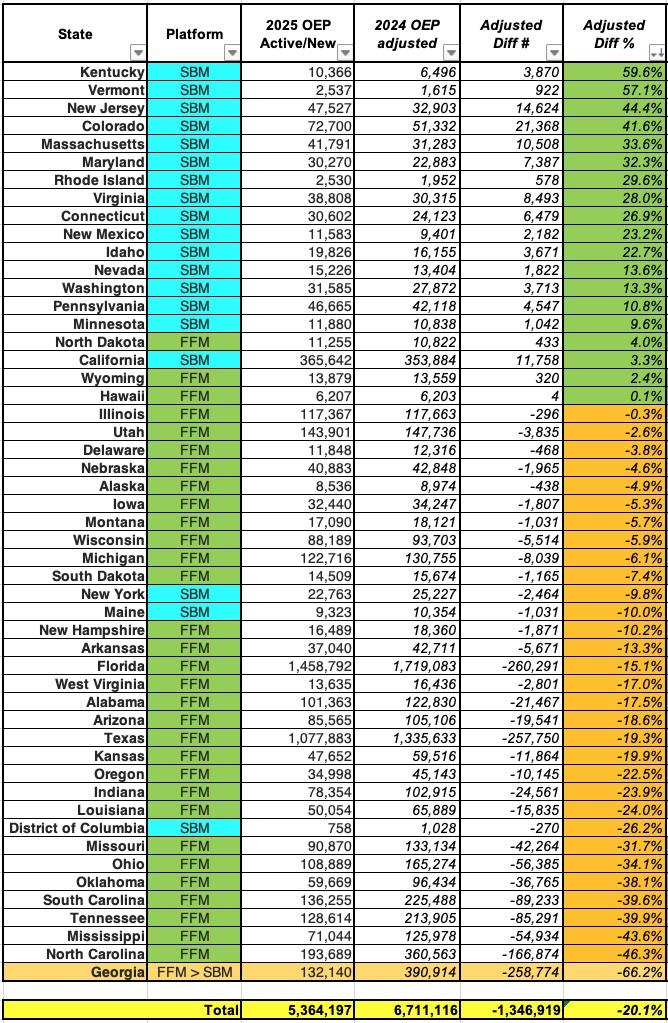 This is important for several reasons. The 2024 data above includes Georgia as an FFM state...but the 2025 data has it rightly listed as an SBM state. The problem is that unlike every other state which has to be adjusted from either 32 to 30 days or from 25 to 23 days...Georgia has to be adjusted from 32 days to 23 days!