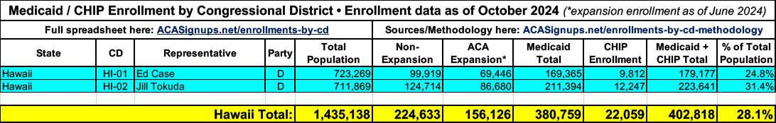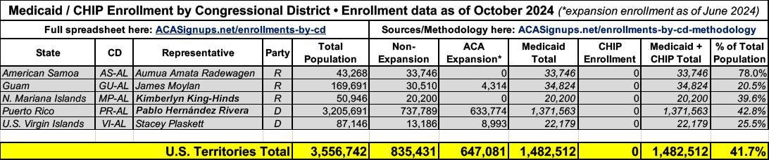 Since I already covered the sources & methodology there, and since the Trump Administration made a ham-handed attempt to cut off Medicaid payment portals yesterday, in this post I've converted the Master Spreadsheet into 52 suitable-for-sharing graphics which break out Medicaid & CHIP enrollment by both state/territory and Congressional District.