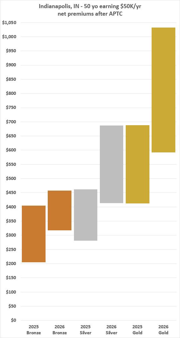 In this case the increase in net pricing from 2025 to 2026 is pretty much entirely due to the expiring tax credits: If 2026 pricing was identical but the enhanced APTC formula was still in place, the enrollee would be eligible for an additional $131/mo in APTC, which would save him an additional $1,572 for the year. This would have knocked the Gold plans down to as low as $217/month. Unfortunately, they'll have to settle for paying as little as $348/mo, which is still $43 less than the least-expensive Silver plan.