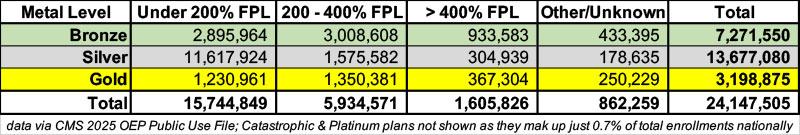 Last year over 12.3 million ACA exchange enrollees received CSR assistance, which (aside from a tiny number of Native American/Alaska Natives) means, by definition, that they earn less than 250% FPL and are enrolled in Silver plans. Of those, I estimate around 9.6 million earn less than 150% FPL, based on data from the 2025 OEP Public Use File. This means that they're currently receiving 94% AV Silver CSR (aka "Secret Platinum) coverage, which is a good thing...and assuming their incomes remain under 150% FPL next year, in just about every case they should stick with it.