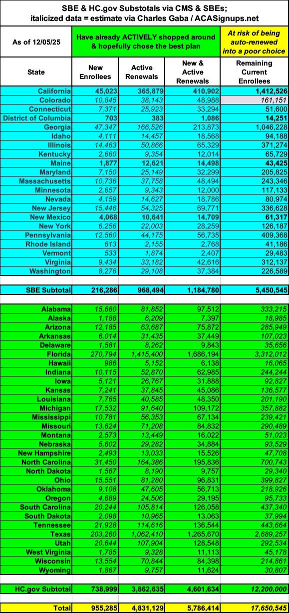 4.83 million active renewals + 5.45 million remaining in the SBEs means there could be up to 12.2 million current enrollees who haven't selected 2026 coverage as of yet in the 30 HealthCare.Gov states.