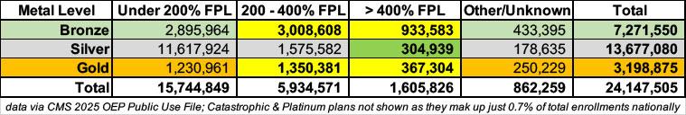 Here's a breakout of current ACA exchange enrollment by metal level and income bracket...