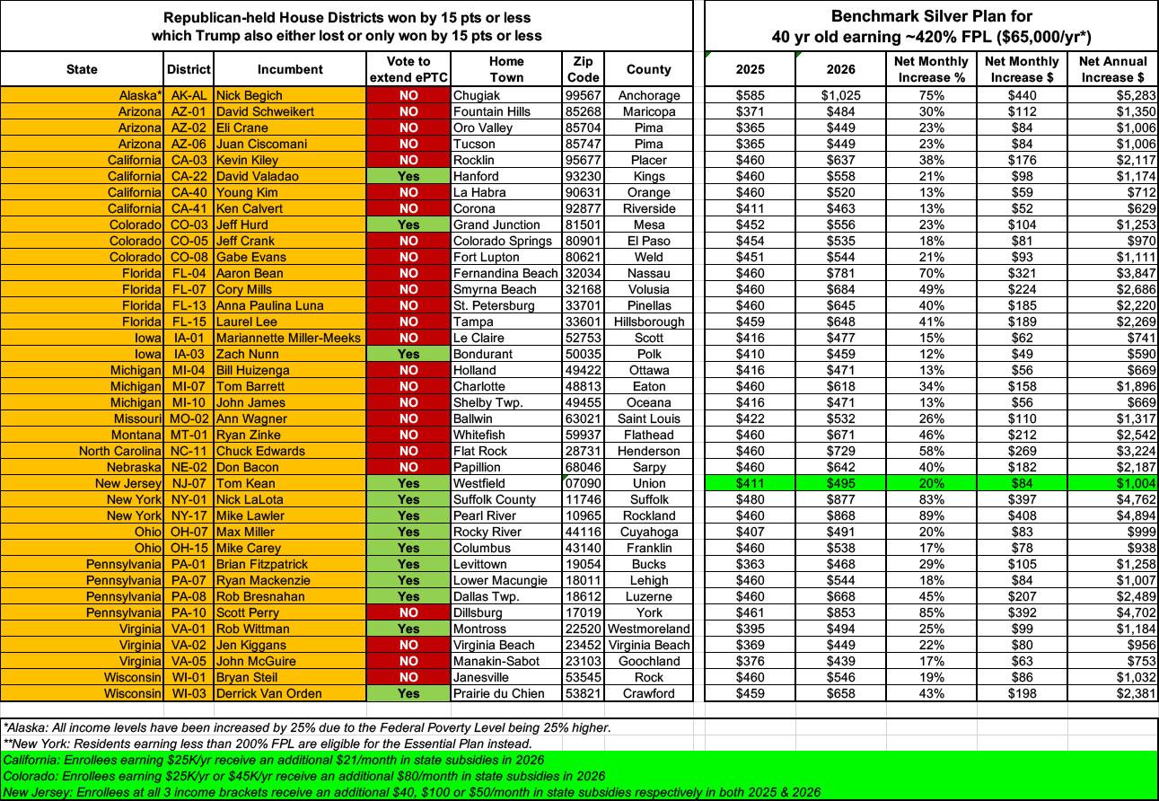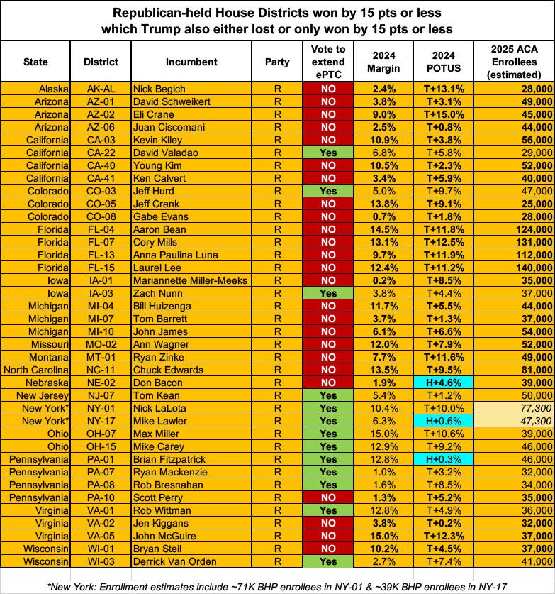 That also means that there are 25 vulnerable House Republicans who just actively voted against extending the enhanced tax credits (there were 5 Republicans who didn't vote at all, but none of them were among the list below).