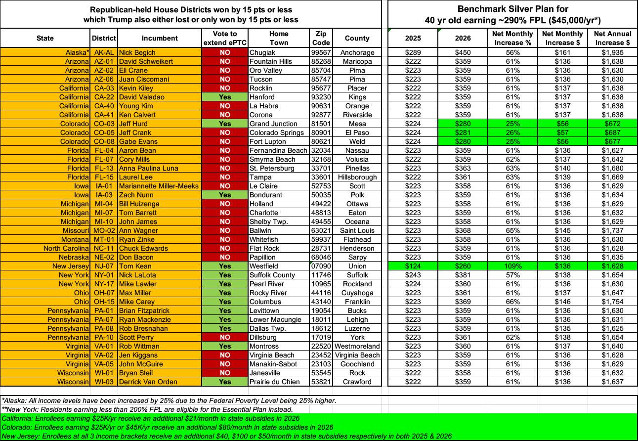 In the end, 17 House Republicans voted with all 213 House Democrats to extend the improved tax credit formula through the end of 2028. Thirteen of the seventeen GOP "Yea" votes represent swing districts (the remaining four were Maria Elvira Salazar in FL-27, Andrew Garbarino of NY-02, David Joyce of OH-14 and Monica DeLa Cruz of TX-15).