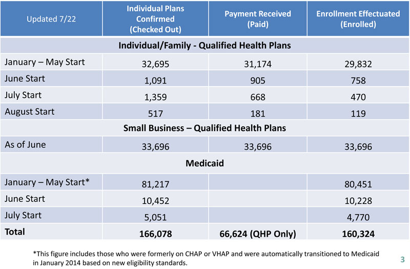 An odd update from the DC exchange...not the update itself, which shows a modest-but-steady increase in QHP enrollment, but the fact that it only runs through July 9th even though it wasn't posted until yesterday (7/28). The prior update ran through July 1st, so that's a net gain of 197 people in 8 days, or about 24 per day. This is actually up slightly from the May/June average of 22/day.