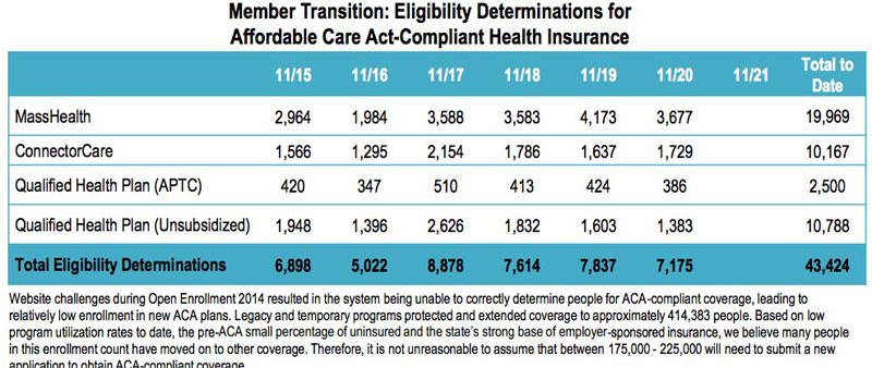 Well, it turns out I had it right in the first place: Massachusetts is about to announce 14,101 QHPs actually selected as of Saturday, out of 28,175 determinations (essentially 50% on the nose)!