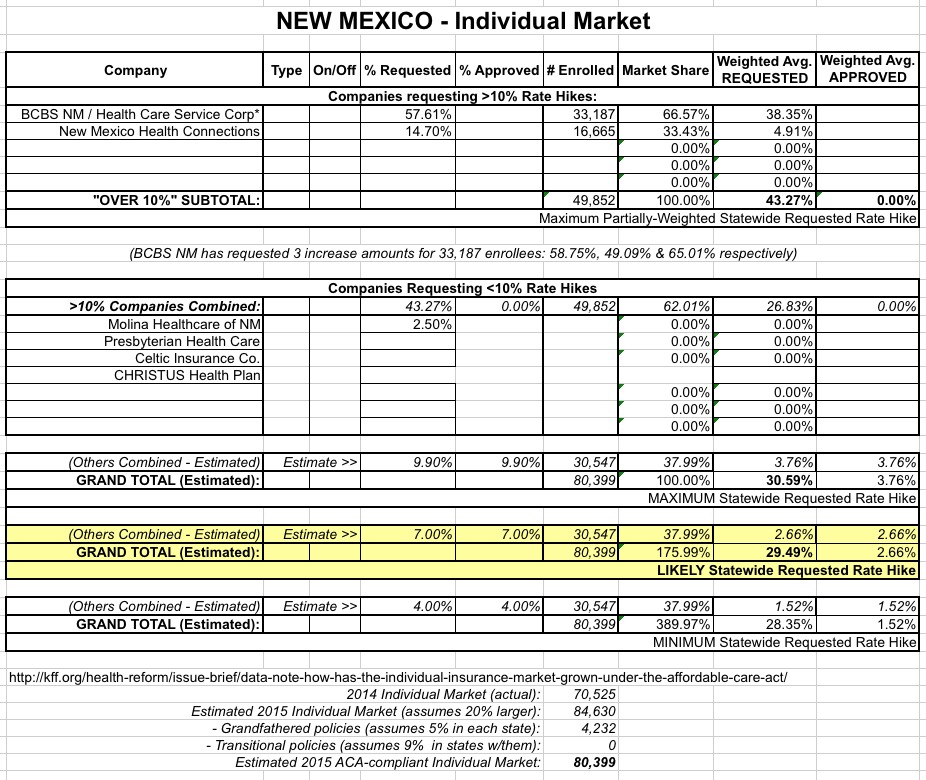 As explained in the first link above, I've still been able to piece together rough estimates of the maximum possible and most likely requested average rate increase for the New Mexico individual market: