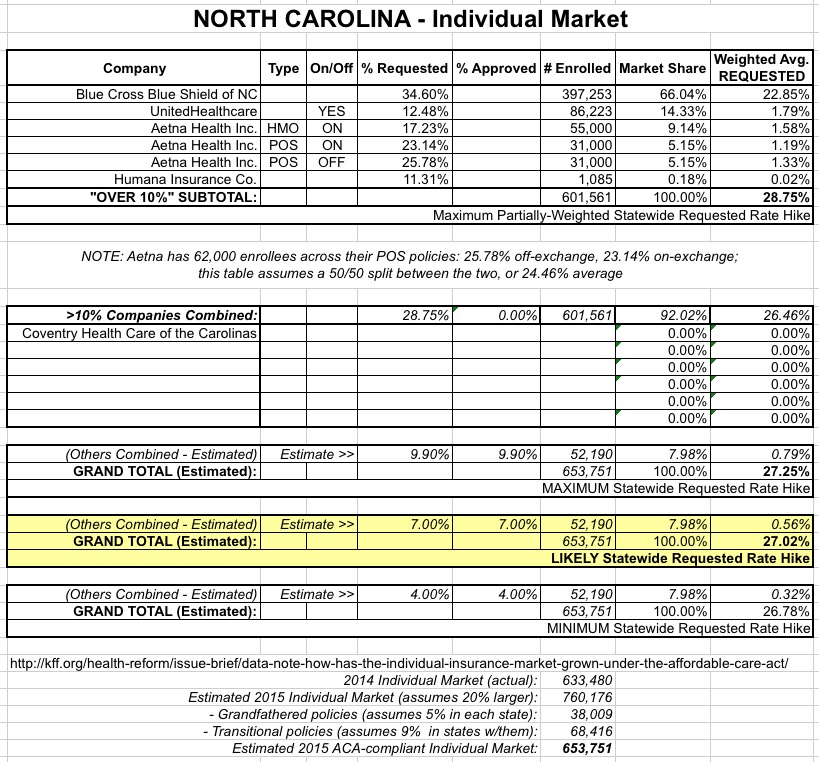 As explained in the first link above, I've still been able to piece together rough estimates of the maximum possible and mid-range requested average rate increase for the North Carolina individual market: