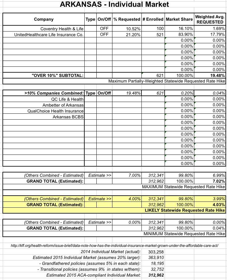 As explained in the first link above, I've still been able to piece together rough estimates of the low, mid-range and maximum possiblerequestedaverage rate increase for the Arkansas individual market. Note: While the table & methodology for Arkansas are the same as most of the other states I've posted on, there's one important difference here; see below for details: