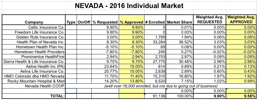 Nevada's insurance dept. rate filing website has an extremely user-friendly, interactive website which lets you drill down and find exactly what you're looking for: Individual or Small Group policies, HMO or PPO, Under Review or Reviewed. From what I can tell, there are 12 companies offering individual policies in 2016 (a 13th, the Nevada Health COOP, just announced that they've gone belly-up and are being dissolved, meaning a minimum of 16,000 Nevadans will have to switch to a different insurance carrier).