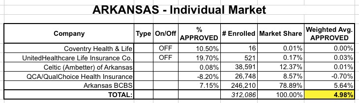 Last week I estimated the overall weighted average rate increases for the Arkansas individual market at "between 4-5%", with a rough estimate of around 4.6%.