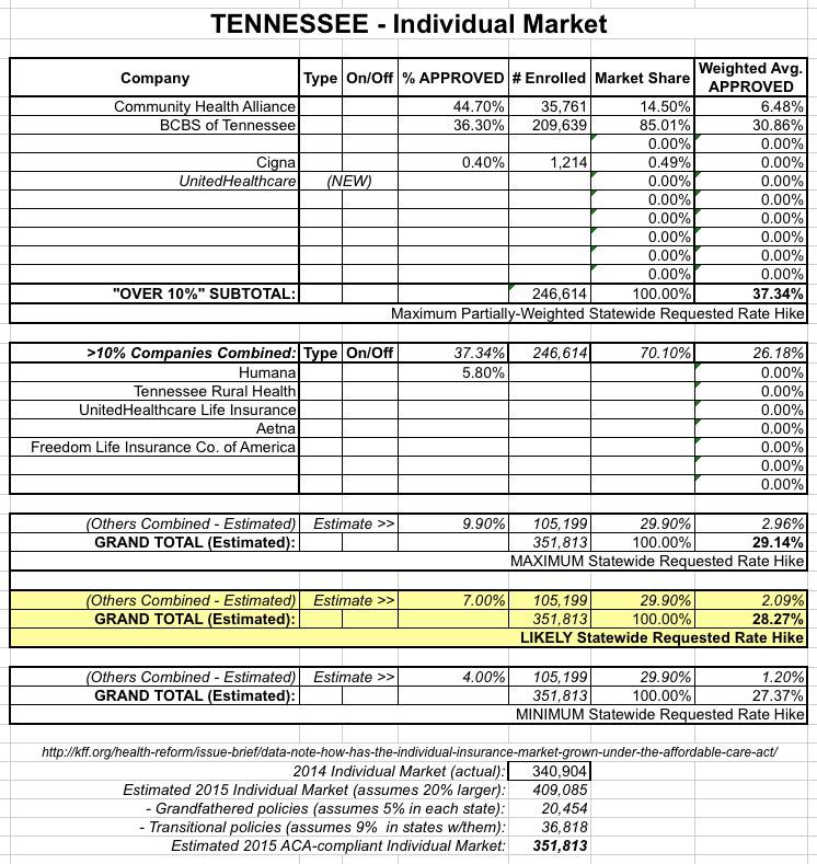 And now you can add Tennessee to the mix. Starting with Louise Norris' exchange-only data (which comes in at a 33% average hike), I've also plugged in additional off-exchange individual market numbers to come up with what looks like an overall average rate hike of around 28.3%: