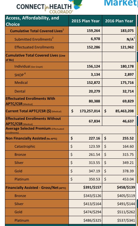 Last month I noted that, assuming I was reading Connect for Health Colorado's monthly dashboard report correctly, they were down to 115,890 effectuated exchange enrollees as of 3/31/16, or a whopping 23.1% lower than the official APTC report tally of 150,769 QHP selections as of the end of Open Enrollment.