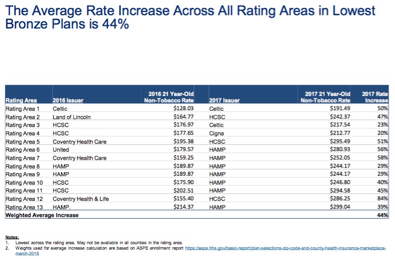 In the case of illinois, it's a little trickier. Unless I'm missing something, the only official notice the IL DOI has released is this PDF, which--while including lots of useful info about rating areas and so forth--doesn't actually list the overall statewide average approved rate increases by carrier.