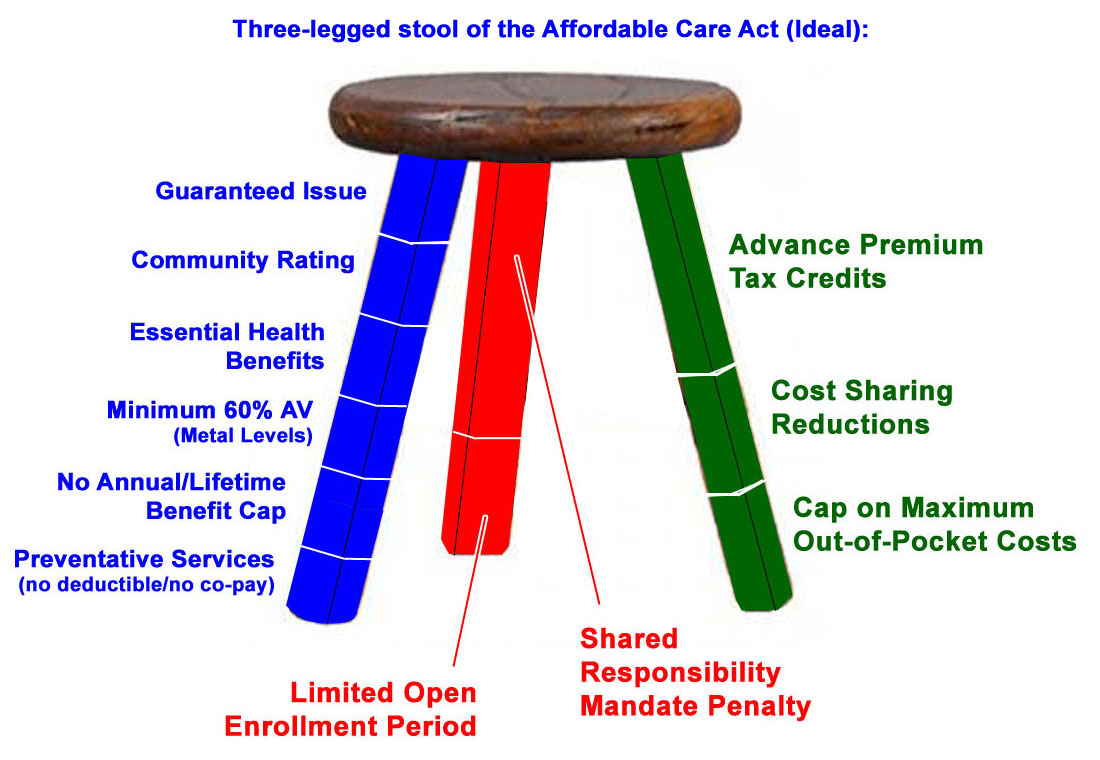 UPDATE: Some people are crediting me with creating the "3-legged stool" metaphor, which simply isn't the case; that credit goes to (I believe) MIT Economics Professor Jonathan Gruber, who came up with the metaphor back in 2006 while helping develop Mitt Romney's "RomneyCare" model for Massachusetts, which was the basis for the ACA's exchange model for the individual insurance market.