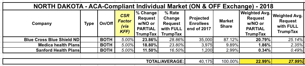 North Dakota's numbers are pretty straightforward. Only three carriers, none of whch say anything about CSR or mandate concerns, so I have to assume that their requested rate increases are the best-case scenario. In addition, the KFF estimates suggest only a 5 point additional CSR factor anyway. This results in roughly a 23% average hike if CSRs are paid vs. a 28% increase if they aren't.