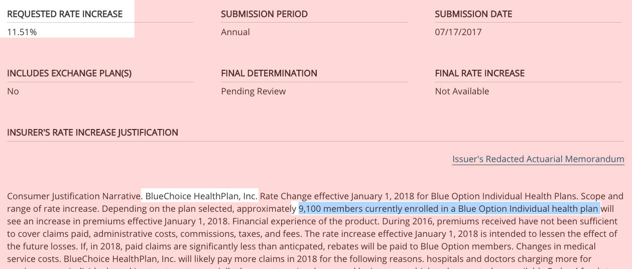 With Blue Cross Blue Shield of Nebraska declining to participate in the Nebraska exchange, that leaves just Medica as the sole individual market carrier. They're asking for a 16.9% average rate hike,