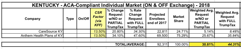 Louise Norris gave me a heads up that the Kentucky Insurance Dept. has posted their 2018 rate hike filings as well. The individual market is pretty straightforward...and pretty grim: Both individual market carriers, CareSource and Anthem, are asking for pretty steep rate hikes even if CSR payments are locked in next year, averaging around 30.8%, while assuming another 13.5 points on top of that (71% of Kaiser's 19% Silver average) would bring the average up to around 44.3%. Not much else to say about this one for the moment.