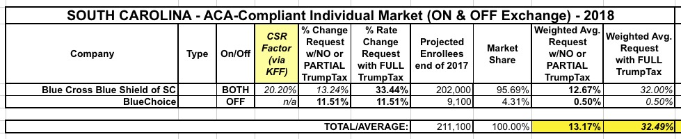 I admit to being a bit confused about the distinction between BCBSSC and BlueChoice HealthPlan, which is also a BCBS carrier...I'm guessing one is for HMOs, the other for PPOs or something. In any event, BlueChoice plans appear to only be available off-exchange, and are thus not subject to the CSR issue. BCBSSC is, however, and the Kaiser Family Foundation estimates that their Silver plans would have to go up 23% if CSR payments are cut off. 87%% of SC exchange enrollees are on Silver plans, so that should be roughly 20.2% across all policies.