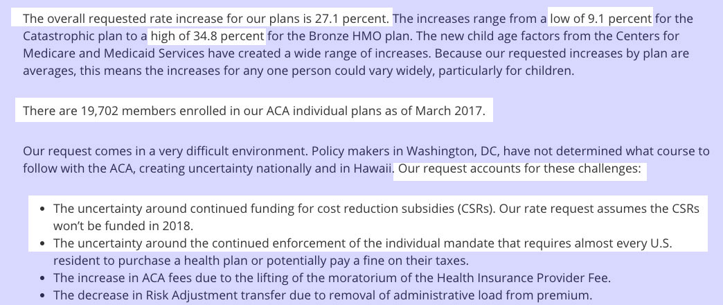 Hawaii only has two carriers on the individual market (and in fact doesn't even have much of an individual market due to a state law mandating that nearly every business provide coverage anyway). HMSA's filing letter is very specific about calling out both the CSR and mandate enforcement sabotage factors as being part of their request. Kaiser doesn't really mention either issue at all, and the only CSR reference in the filing seemed to assume it would be paid, so I have one in each category. Kaiser Family Foundation assumes a 21% Silver CSR rate hike, and 71% of Hawaii's exchange enrollees are on Silver plans, so that amounts to roughly a 15% overall CSR factor.