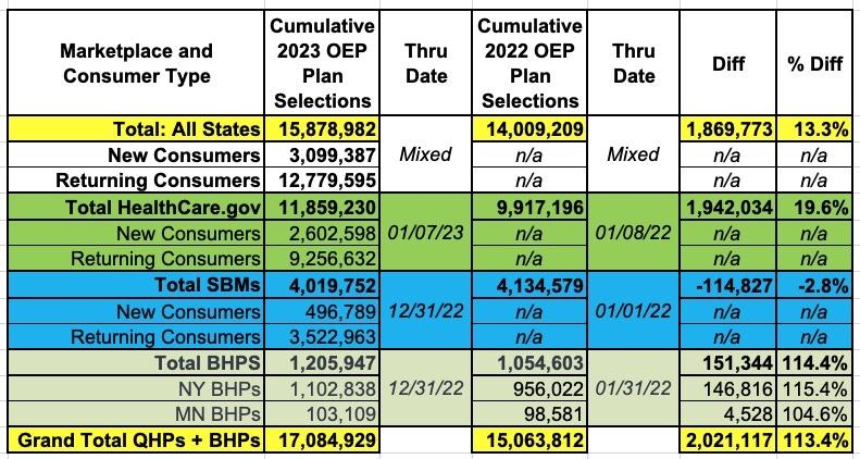 There's still likely between 40,000 - 80,000 Qualified Health Plan (QHP) enrollments to be added to the 2023 Open Enrollment Period (OEP) tally from the states which have extended deadlines (through Tuesday, January 31st), but I decided to throw this together today for the hell of it.