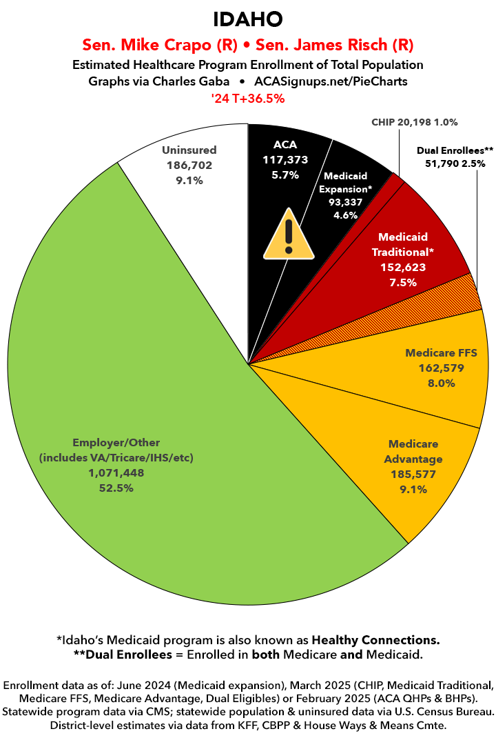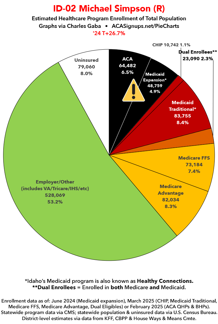 UPDATE 7/3/25: I've updated the web versions of the graphics with the most up-to-date enrollment data I have access to. The black sections w/the ⚠️ symbol are those most at risk of losing healthcare coverage due to H.R. 1, the "One Big Beautiful Bill Act" (aka the #MAGAMurderBill).