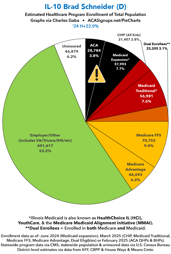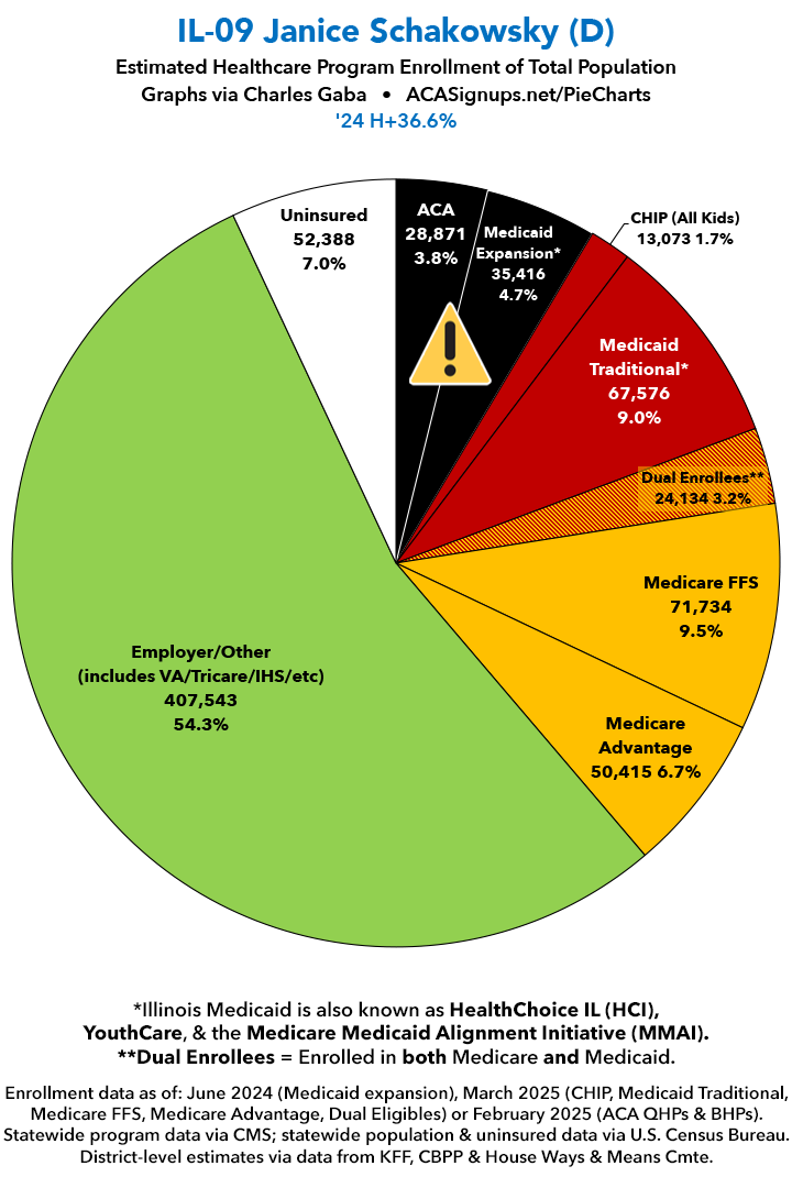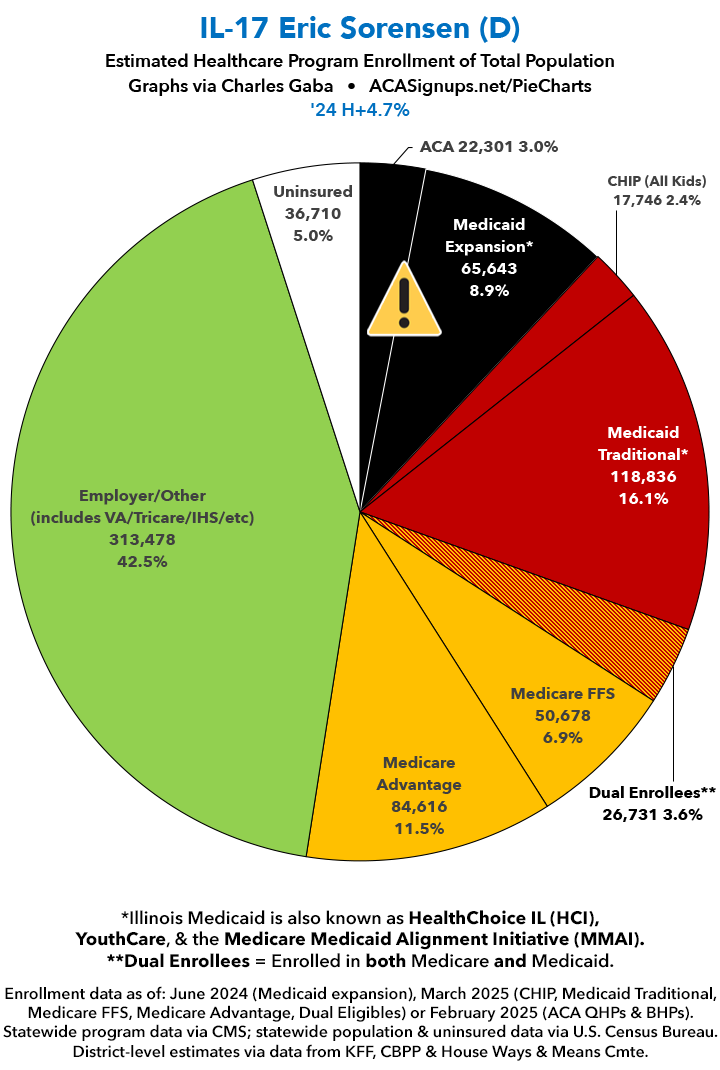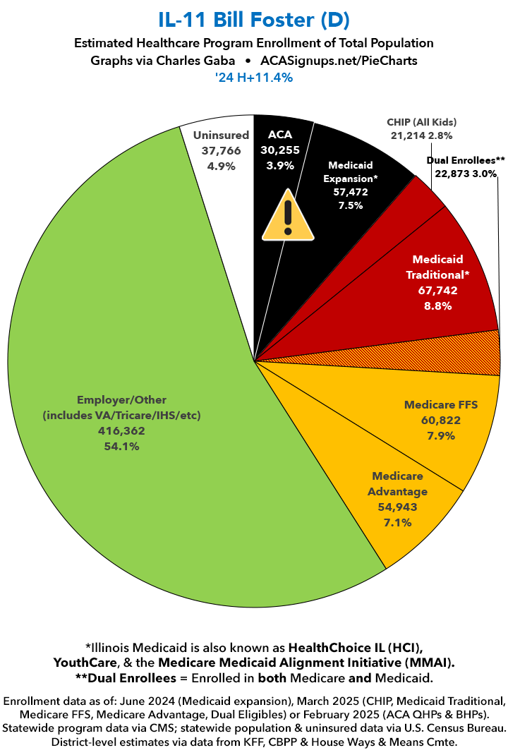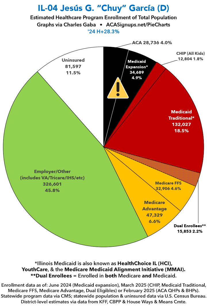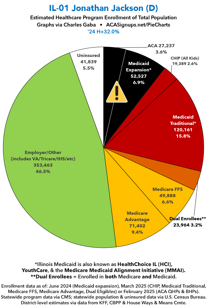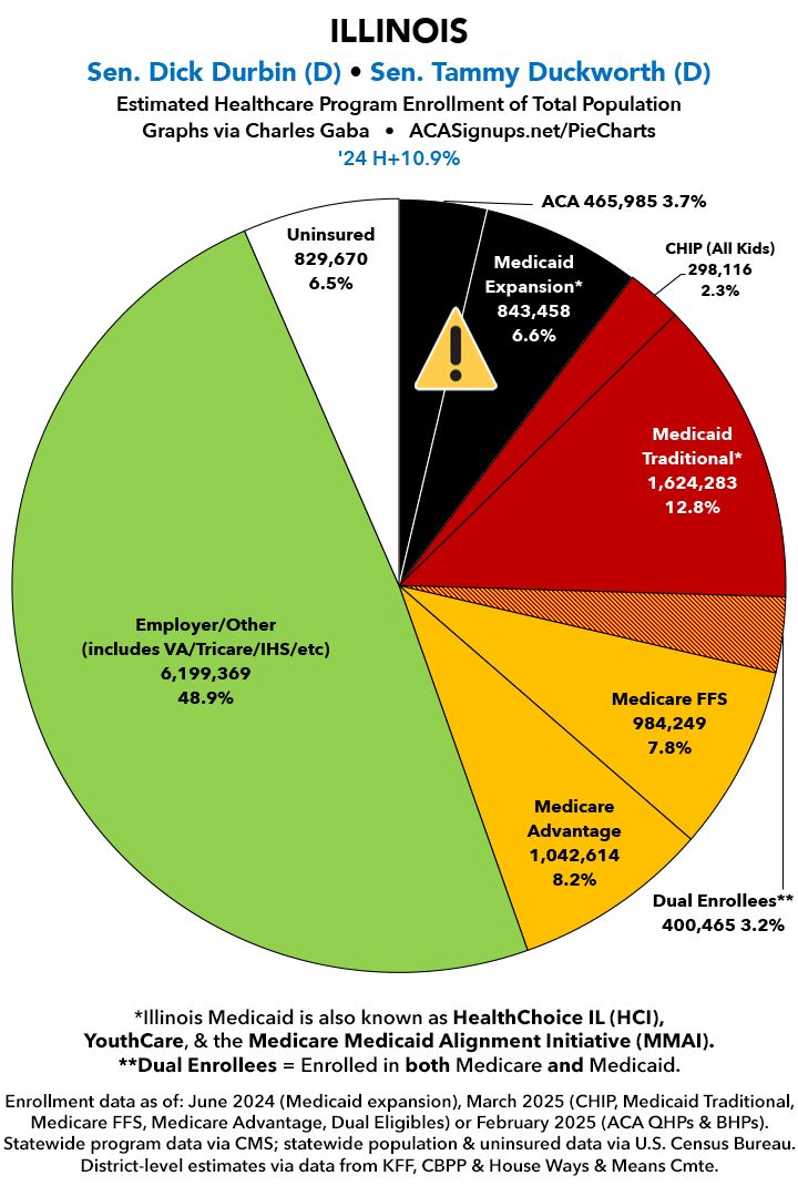 UPDATE 7/3/25: I've updated the web versions of the graphics with the most up-to-date enrollment data I have access to. The black sections w/the ⚠️ symbol are those most at risk of losing healthcare coverage due to H.R. 1, the "One Big Beautiful Bill Act" (aka the #MAGAMurderBill).