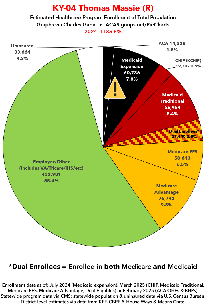 UPDATE 7/5/25: I've updated the web versions of the graphics with the most up-to-date enrollment data I have access to. The black sections w/the ⚠️ symbol are those most at risk of losing healthcare coverage due to H.R. 1, the "One Big Beautiful Bill Act" (aka the #MAGAMurderBill).