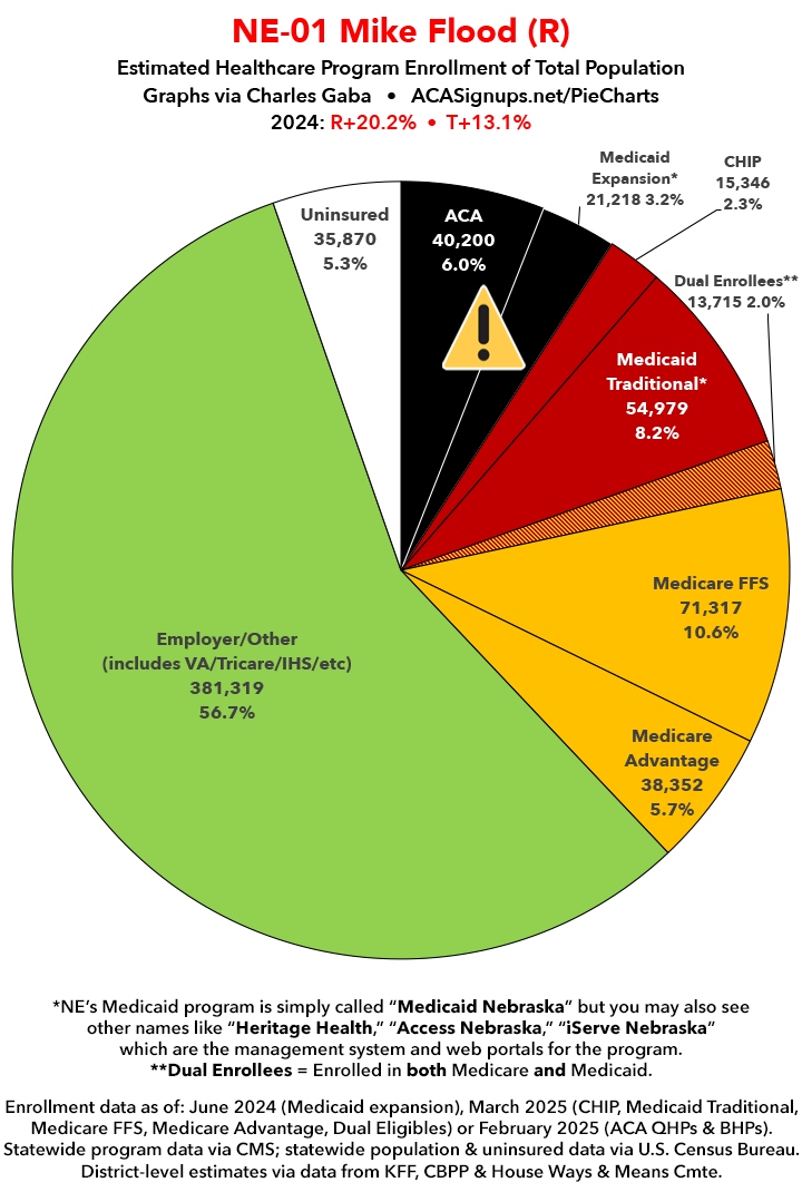 UPDATE 7/6/25: I've updated the web versions of the graphics with the most up-to-date enrollment data I have access to. The black sections w/the ⚠️ symbol are those most at risk of losing healthcare coverage due to H.R. 1, the "One Big Beautiful Bill Act" (aka the #MAGAMurderBill).
