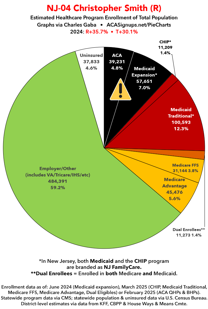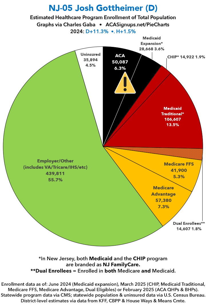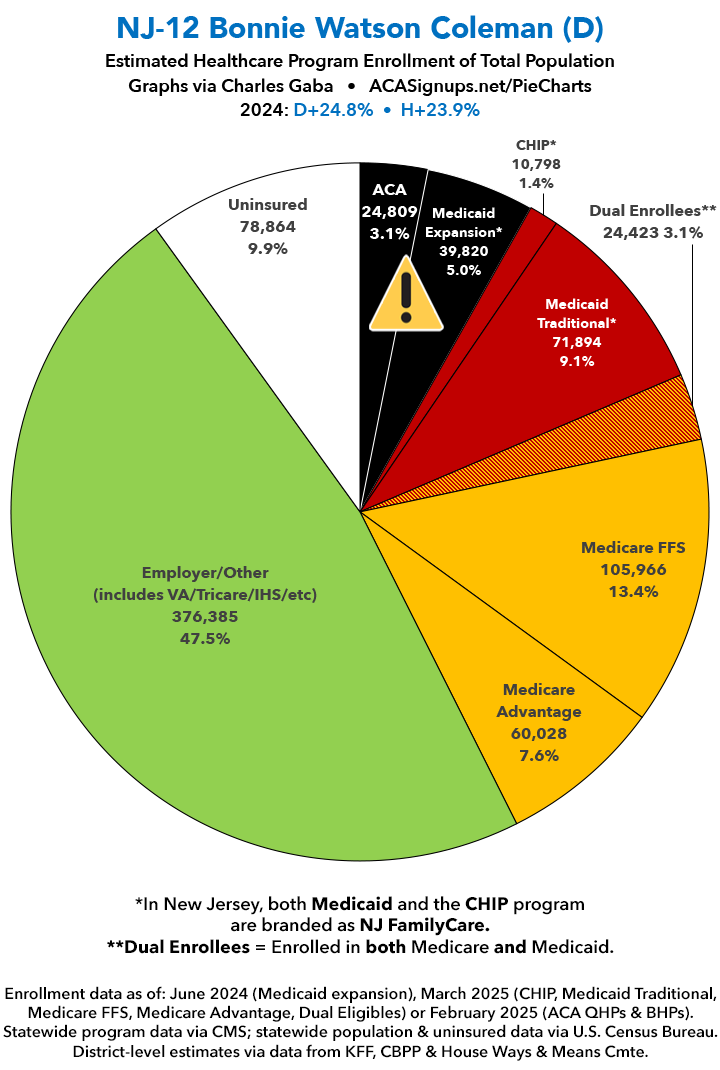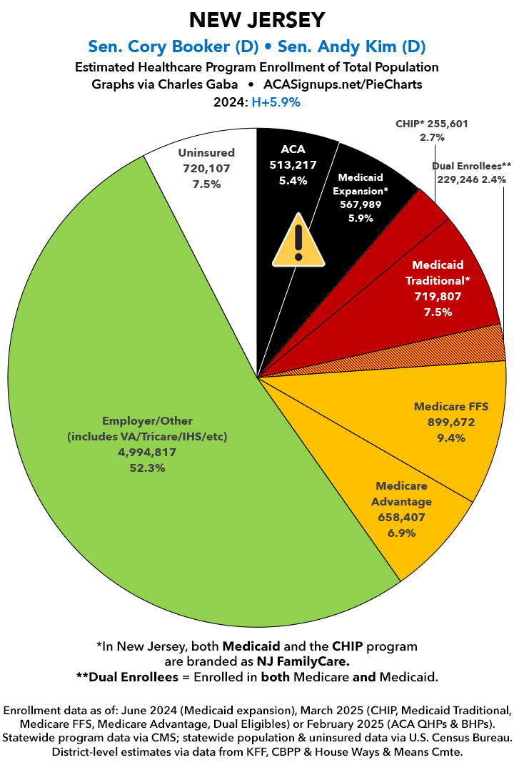 UPDATE 7/8/25: I've updated the web versions of the graphics with the most up-to-date enrollment data I have access to. The black sections w/the ⚠️ symbol are those most at risk of losing healthcare coverage due to H.R. 1, the "One Big Beautiful Bill Act" (aka the #MAGAMurderBill).
