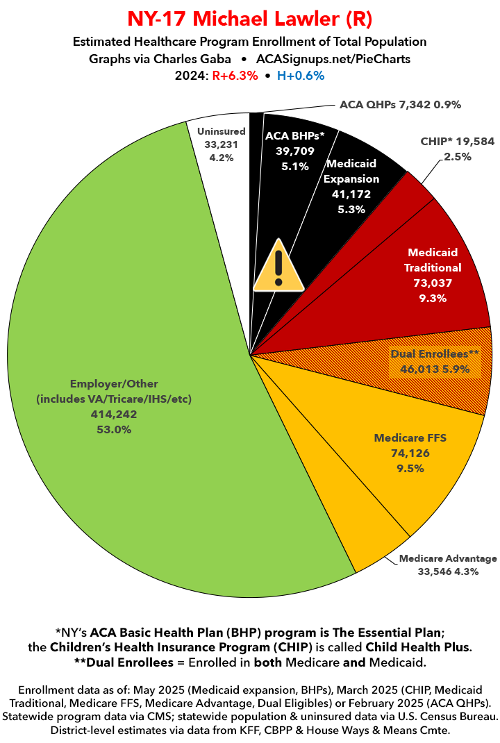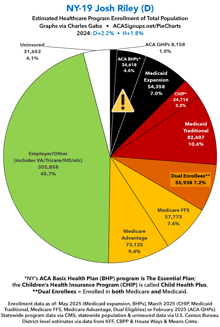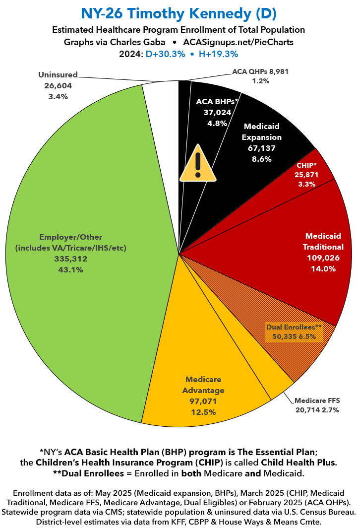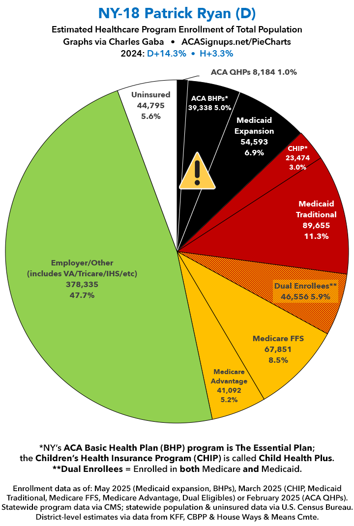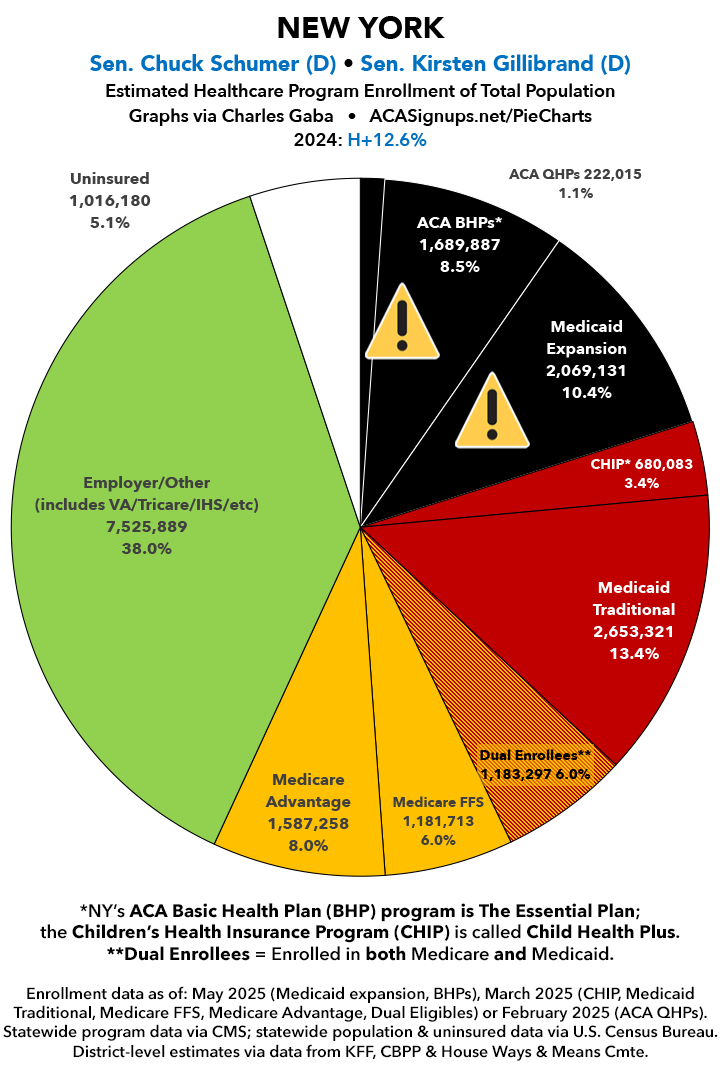 UPDATE 7/9/25: I've updated the web versions of the graphics with the most up-to-date enrollment data I have access to. The black sections w/the ⚠️ symbol are those most at risk of losing healthcare coverage due to H.R. 1, the "One Big Beautiful Bill Act" (aka the #MAGAMurderBill).