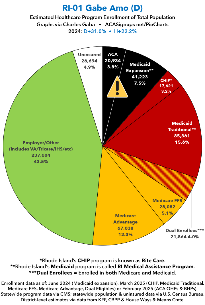 UPDATE 7/16/25: I've updated the web versions of the graphics with the most up-to-date enrollment data I have access to. The black sections w/the ⚠️ symbol are those most at risk of losing healthcare coverage due to H.R. 1, the "One Big Beautiful Bill Act" (aka the #MAGAMurderBill).