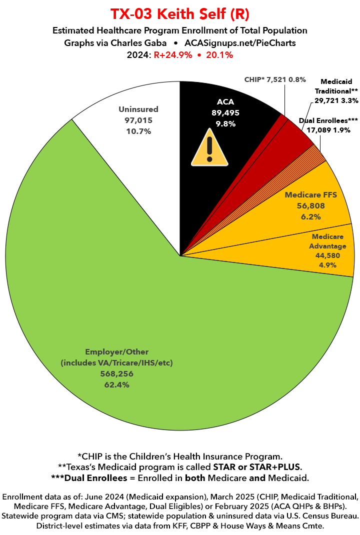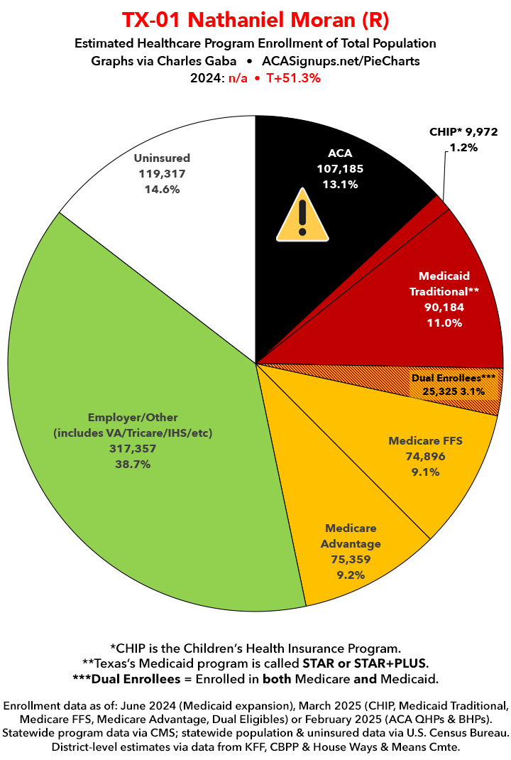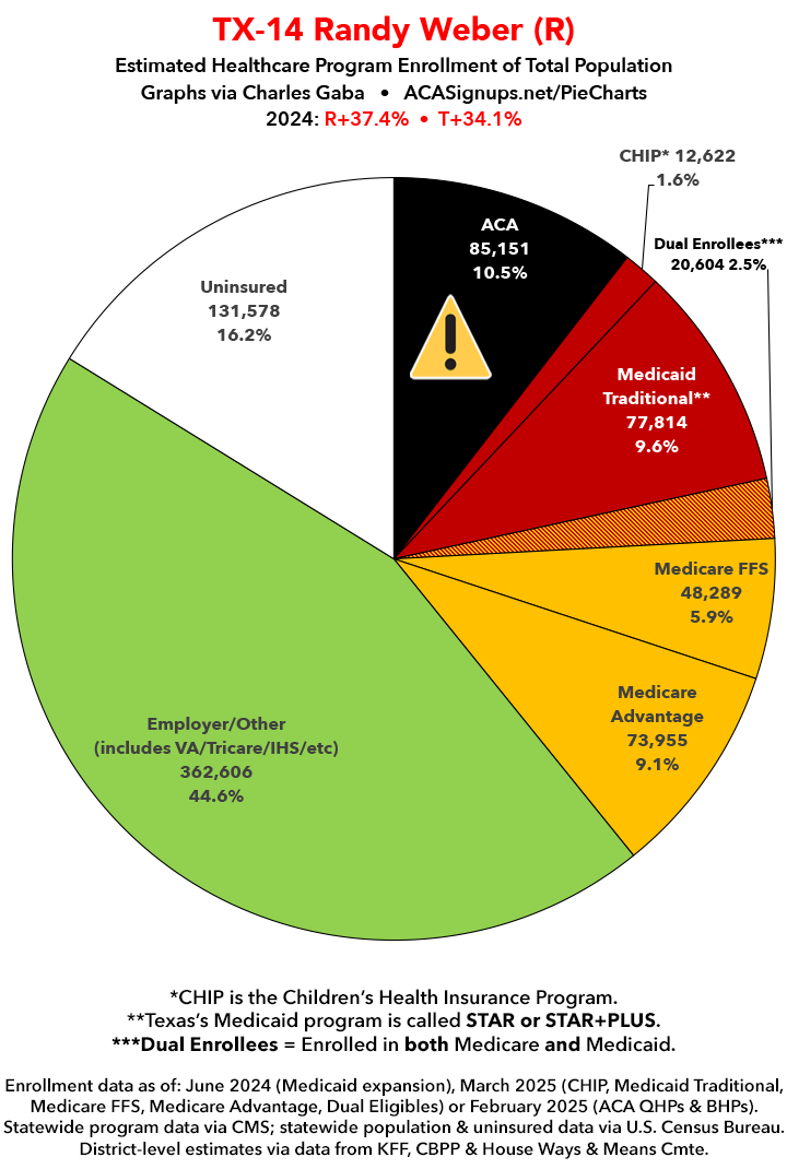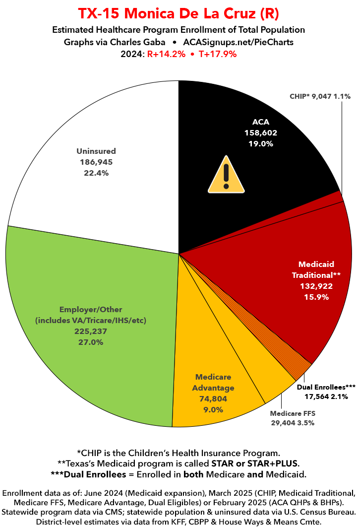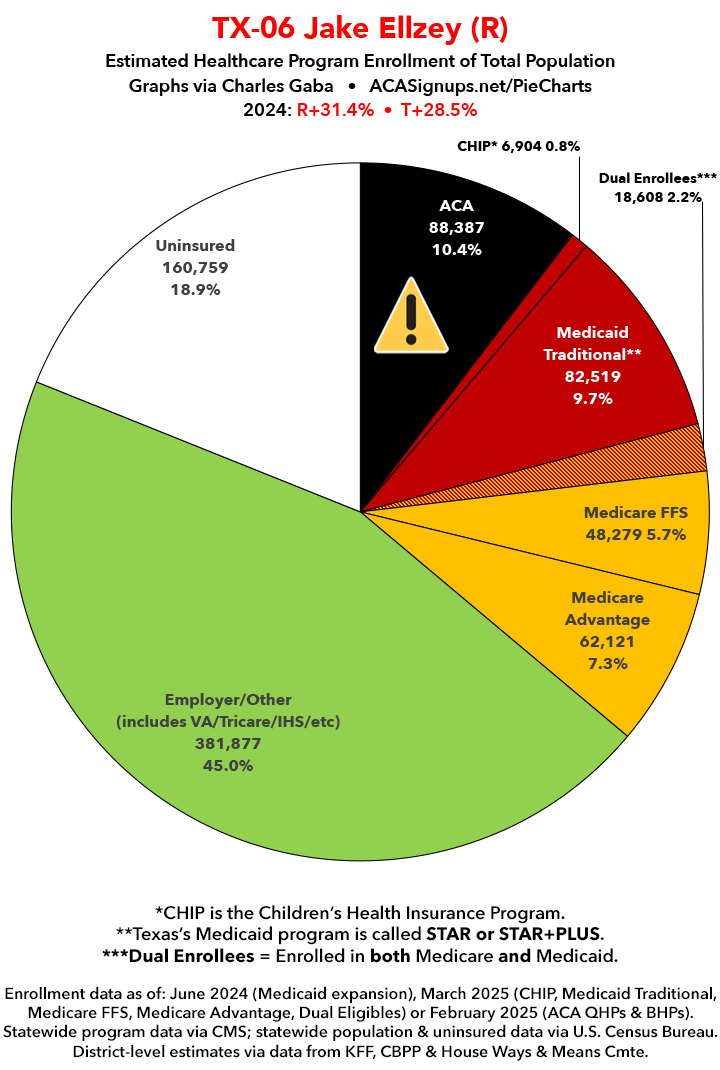 UPDATE 7/13/25: I've updated the web versions of the graphics with the most up-to-date enrollment data I have access to. The black sections w/the ⚠️ symbol are those most at risk of losing healthcare coverage due to H.R. 1, the "One Big Beautiful Bill Act" (aka the #MAGAMurderBill).