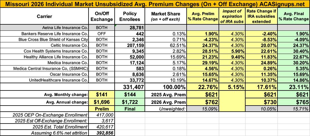 Missouri has around ~417,000 residents enrolled in ACA exchange plans, 94% of whom are currently subsidized. I estimate they also have another ~3,600 unsubsidized off-exchange enrollees.