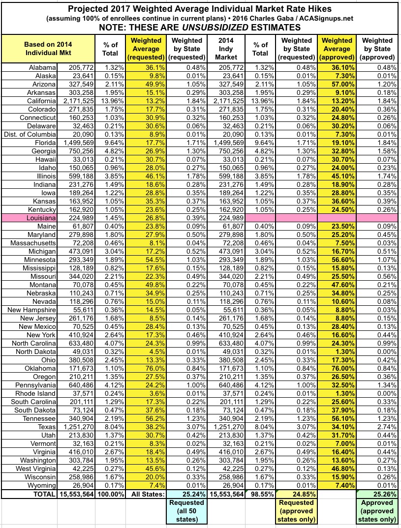 When you average all three methods together, the weighted UNSUBSIDIZED approved rate hike average for EVERY state except for Louisiana comes in at 25.1%:
