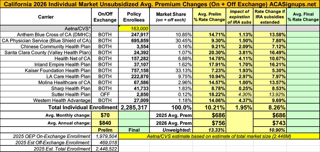 UPDATE 10/5/25: According to the California Insurance Dept. rate review filings site, all of the 2026 individual market filings have been finalized with only nominal tweaks to any of the average rate increases. The overall weighted average drops slightly from 10.2% to 10.1%, although Covered California seems to be sticking with 10.3%, so who knows...