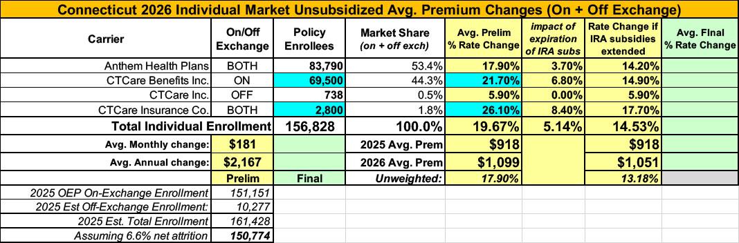 2026 Final Gross Rate Changes - Connecticut: +16.8%; ~156,000 enrollees are in for a major shock this fall (updated)