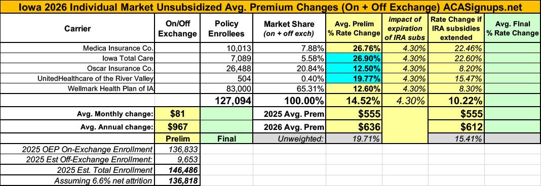 UPDATE 8/14/25: Iowa Total Care, Oscar Insurance and UnitedHealthcare of the River Valley have submitted revised filings bumping up the weighted average increase to 14.5%.
