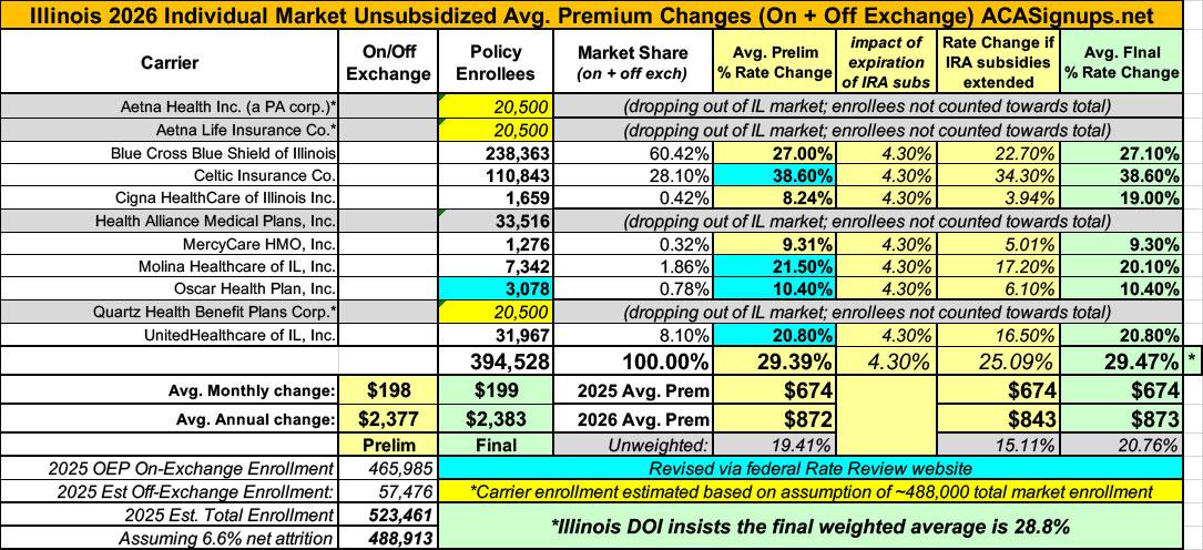 UPDATE 9/8/25: The Illinois Dept. of Insurance has issued their final/approved decisions on the 2026 rate filings, and the net result is a slight decrease in the weighted average to 28.8% (even though my own math has it coming in ever so slightly higher).