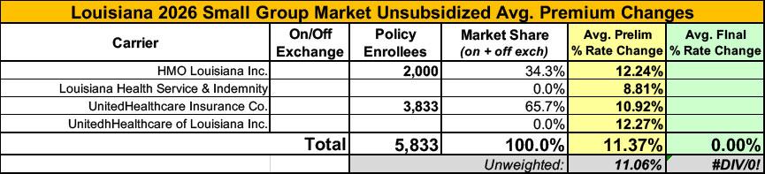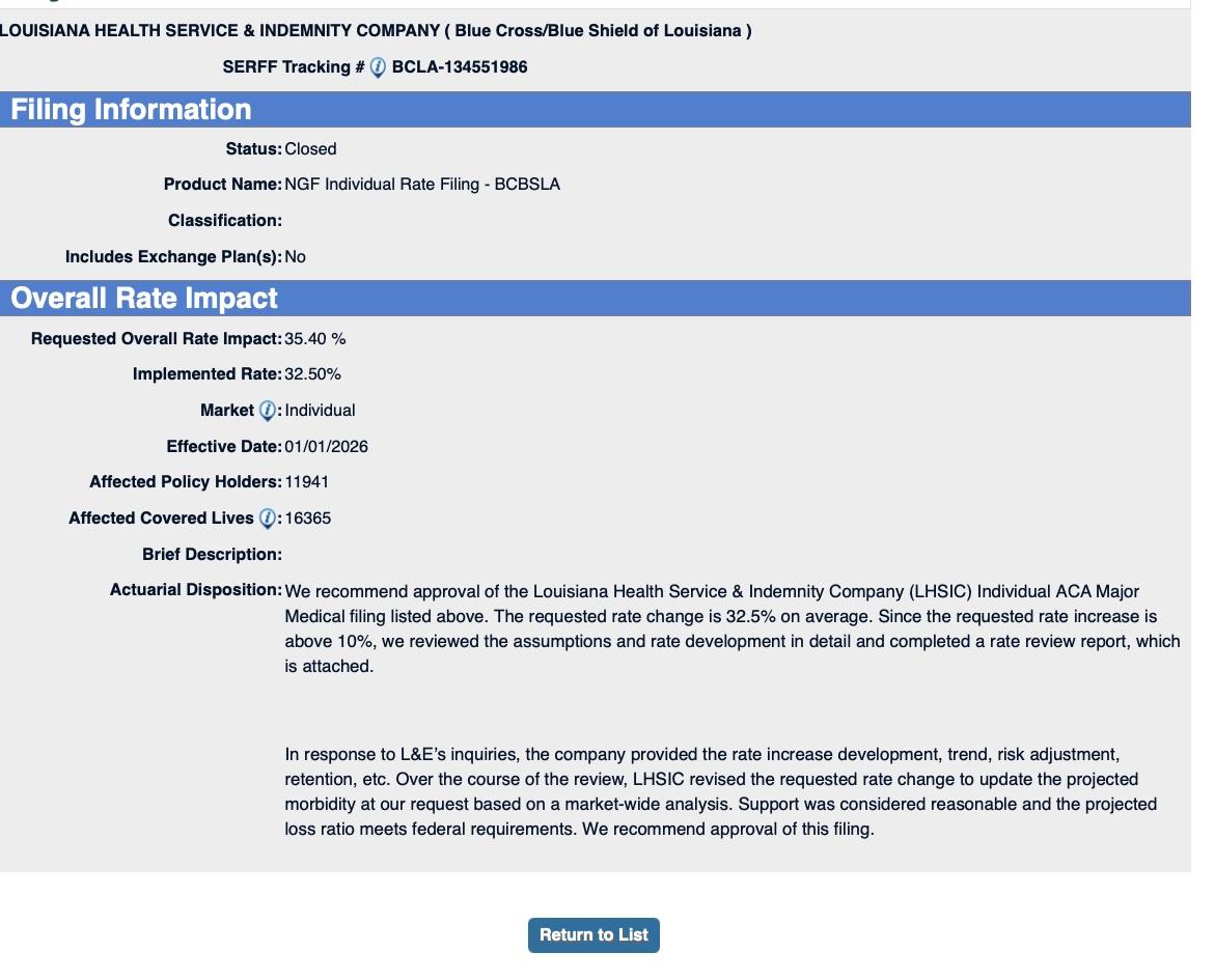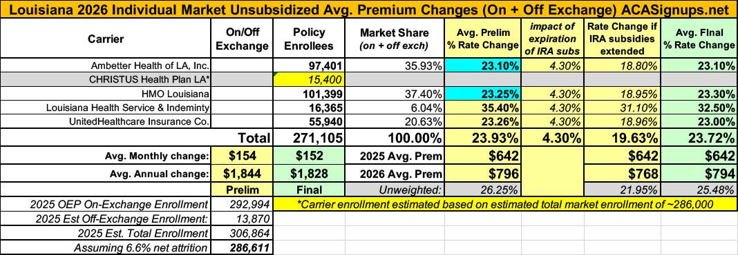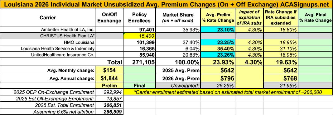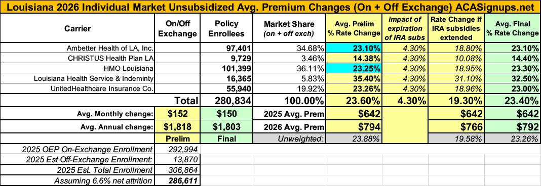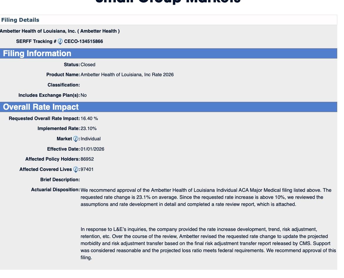 UPDATE 8/14/25: Ambetter and HMO Louisiana have submitted revised filings which, combined with my revising my estimate of the total LA individual market down to 286,000, results in the weighted average rate increase going up by 2 points to 23.9%.