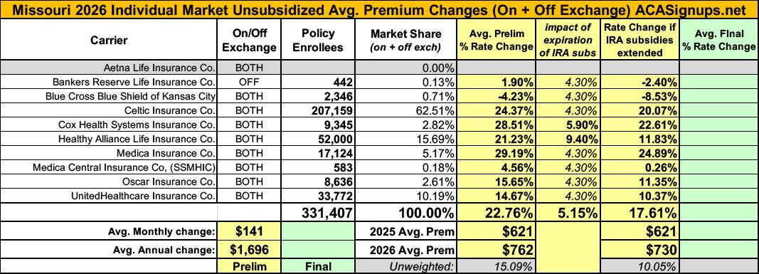 2026 Final Gross Rate Changes - Missouri: +23.1%; ~417,000 enrollees looking at massive rate hikes in January (updated)