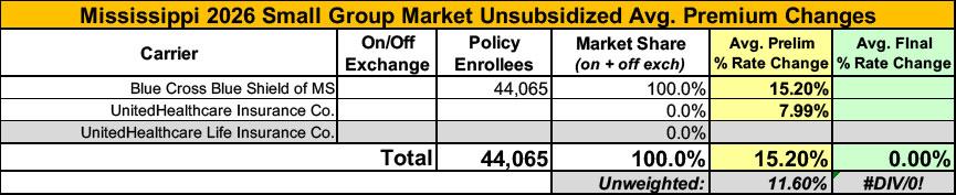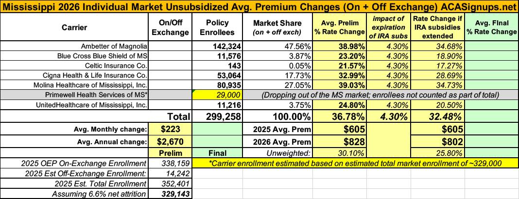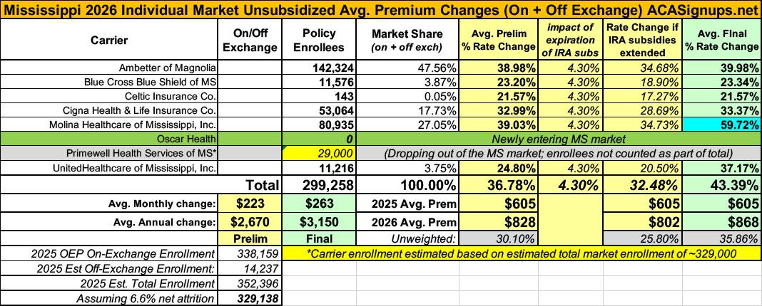 2026 Final Gross Rate Changes - Mississippi: +43.4%; ~330,000 enrollees facing MASSIVE rate hikes starting in January (updated)