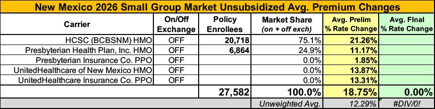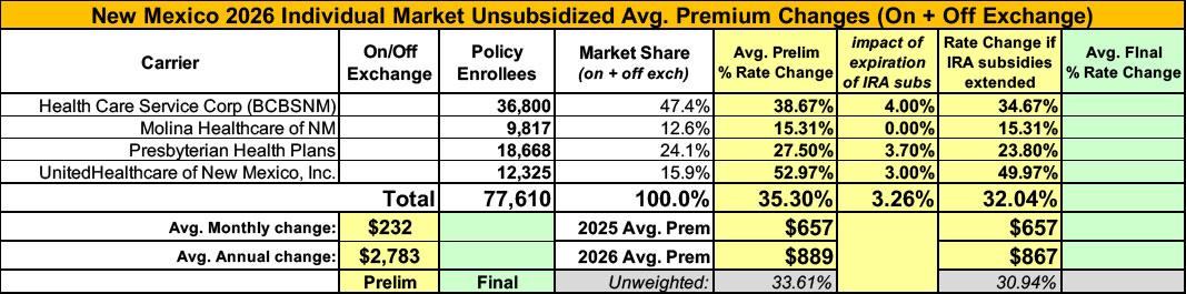 UPDATE 8/29/25: The New Mexico Office of Superintendent of Insurance (OSI) has issued a press release stating that they've approved the rate filings for all 4 individual market carriers with a weighted average increase of 35.7% (slightly higher than the preliminary 35.3%). From what I can tell the actual weighted average of the approved filings is slightly lower at 35.1%, but I'll have to go with NM OSI as the final word: