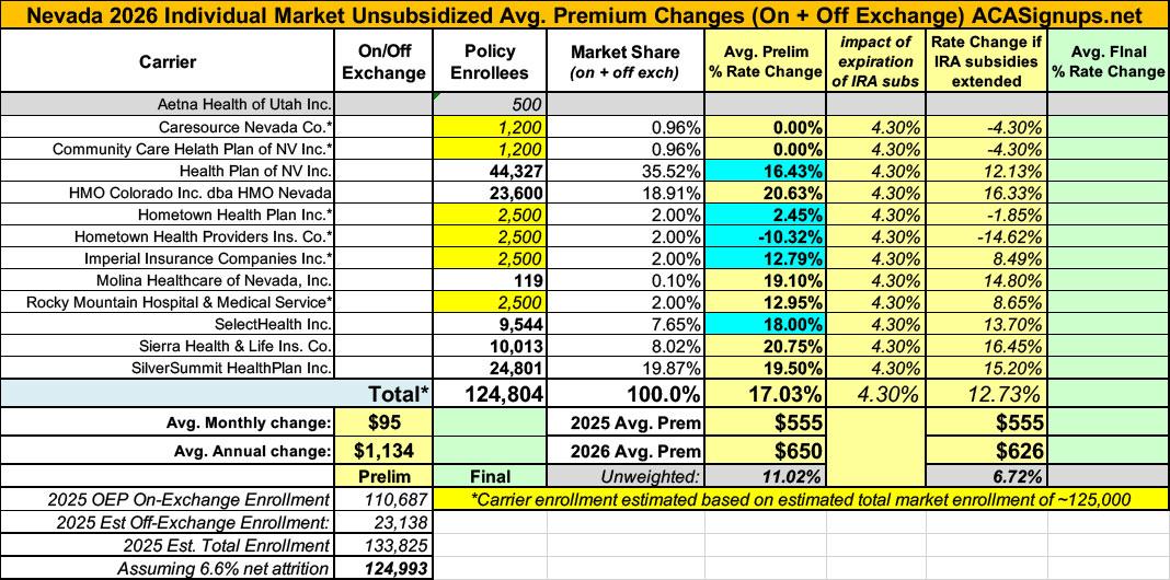 Unfortunately I've only been able to acquire the actual enrollment totals for about half of the NV carriers, but the press release clarifies that the weighted statewide average rate increase is 17.5%. Also, while the total of the 6 carriers with enrollment data add up to 112,404 enrollees, on-exchange enrollment alone as of the end of the 2025 Open Enrollment Period was 110,687, so there are definitely some missing enrollees across the remaining 6 carriers.