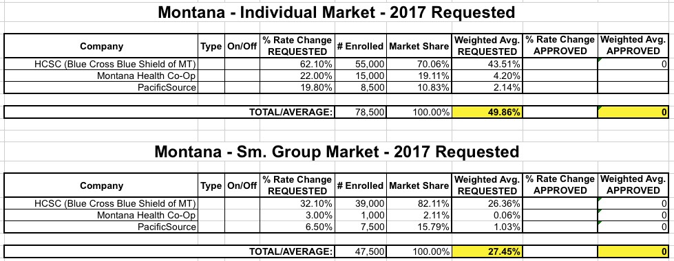 As I noted Monday morning, I believe that August 1st was the deadline for every state to submit their 2017 rate filings, meaning that the 14 states missing from my Requested Rate Hike Project are finally available to be plugged into the spreadsheet. I'll also be going back through the other states I've been tracking since as early as April to see which ones require updates due to carriers dropping out, joining in or resubmitting their rate requests.
