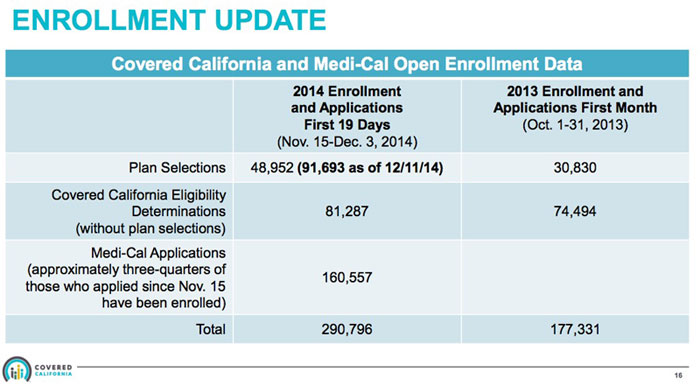 A nice update out of California...but still a frustrating one. They held an executive board meeting today at which they posted an updated QHP selection total for 2015: 91,693 as of 12/11/14. Unfortunately, this still doesn't include any renewal data for existing enrollees.