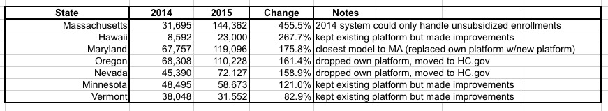 This isn't an exact apples-to-apples comparison, since the Massachusetts number includes the "overtime" extension period while the other 5 states only run through 2/15/15, but I thought it would be useful to see how the 6 exchanges which had widespread technical issues last year fared this time around. Obviously other states like Washington and California had some snafus, but these are the ones which were seriously hosed last year to the point of requiring massive overhauls or which were completely scrapped in favor of a new platform (I'm not including HC.gov itself here since everyone already knows what massive technical improvements they've made).